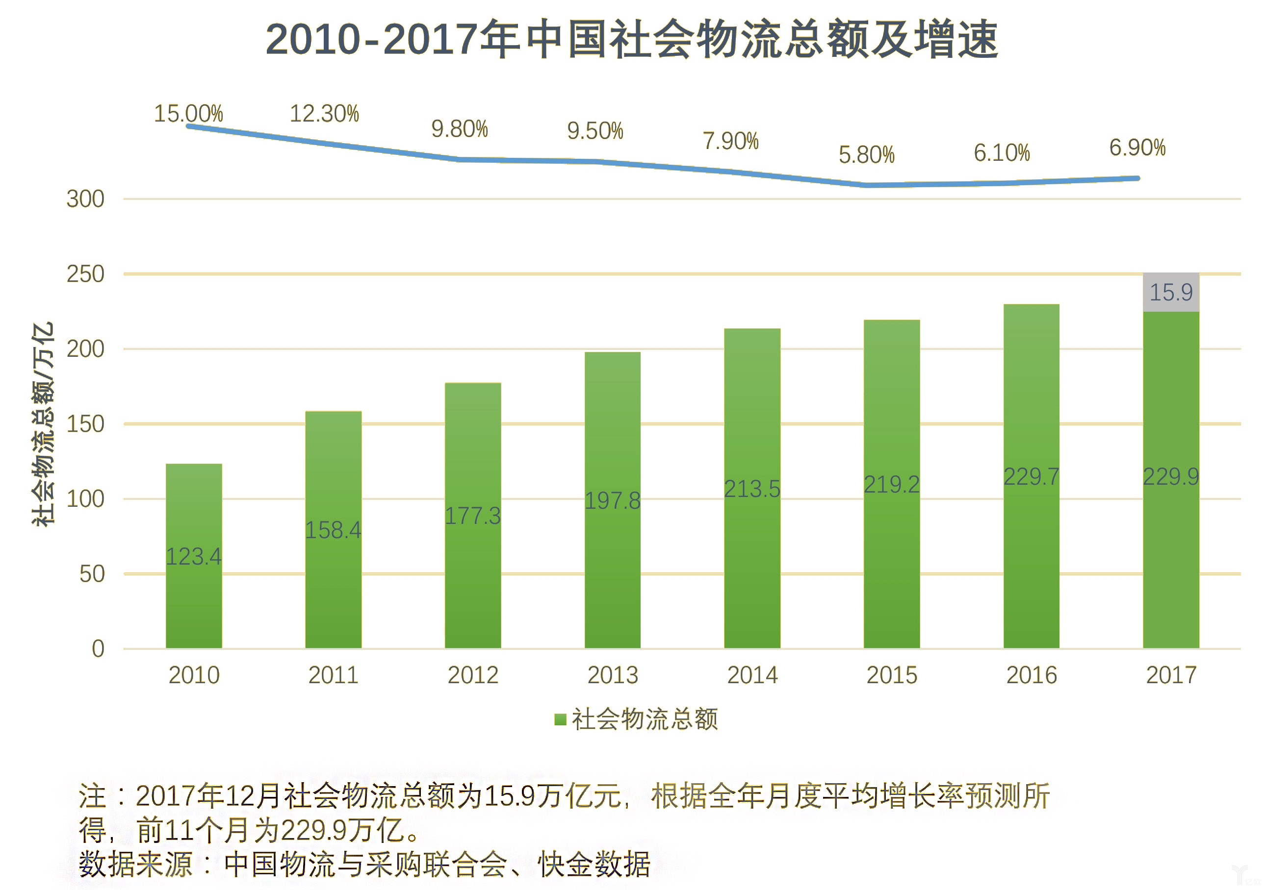 據中國物流與采購聯合會公布的1-11月物流運行數據顯示,2017年1-11月,全國社會物流總額為229.9萬億元(同比增長6.7%),而這一數字已超過2016年全年的229.7萬億,2017年仍舊保持了緩中趨穩、穩中向好的基本態勢。
