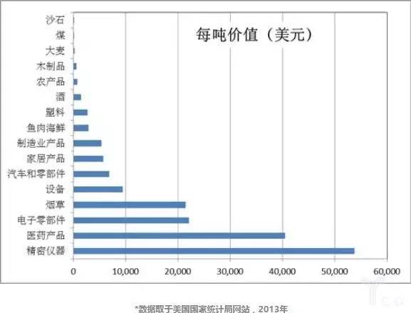 同樣一公斤貨,因為單公斤貨物價值的不同會對GDP產(chǎn)生很大影響。為了更好理解這個概念,我準備了下面一張圖表,是美國不同類別的貨物平均每噸的價值,可以看到差別非常大,一噸煤和一噸煙草價值可以相差100倍。